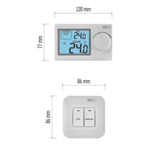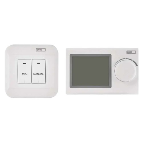 częstotliwość pracy: 868 MHz|długość czujnika kapilarowego: nie dotyczy|funkcja ON/OFF: tak|funkcja Set-back: nie dotyczy|ilość programów: temperatura ustawiana przez użytkownika|kalibracja temperatury: tak|kolor: biały|możliwość podłączenia następnych detektorów: nie dotyczy|opakowanie: 1 szt., pudełko|podświetlany wyświetlacz: tak|pomiar temperatury: 0 °C do 40 °C, rozdzielczość 0,1 °C|rodzaj regulacji: system grzewczy i chłodzący|rodzaj sterowania: ręczny elektroniczny termostat pokojowy|rodzaj termostatu: bezprzewodowy|rodzaj ustawienia temperatury: ręcznie|tryb przeciwzamrożeniowy: tak|tryb wakacyjny: nie dotyczy|ustawialna histereza temperatury: ±0,2 °C|ustawienie temperatury: 5 °C do 35 °C, co 0,5 °C|włączane obciążenie: 16 A oporowo, 4 A indukcyjnie|włączanie: 230 V AC albo beznapięciowy|wymiary: nie dotyczy|wymiary bramy: nie dotyczy|wymiary nadajnika: 28 × 120 × 77 mm|wymiary odbiornika: 26 × 86 × 86 mm|w zestawie: nie dotyczy|zasięg na otwartej przestrzeni: 100 m|zasilanie: nie dotyczy|zasilanie bramy: nie dotyczy|zasilanie nadajnika: 2× 1,5 V AAA (w zestawie)|zasilanie odbiornika: 230 V AC