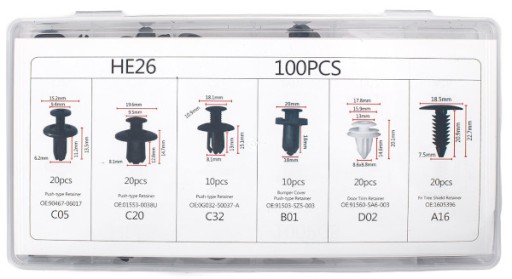 - Zestaw 100 uniwersalnych spinek samochodowych.
