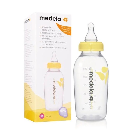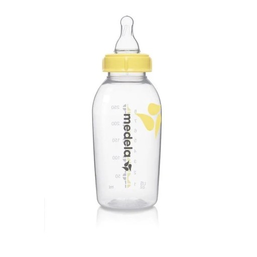 Nietłukące się butelki Medela dostępne są w dwóch różnych rozmiarach: 150 ml ze smoczkiem z wolnym przepływem i 250 ml ze smoczkiem ze średnim przepływem. Smoczki na wymianę są dostępne osobno.
