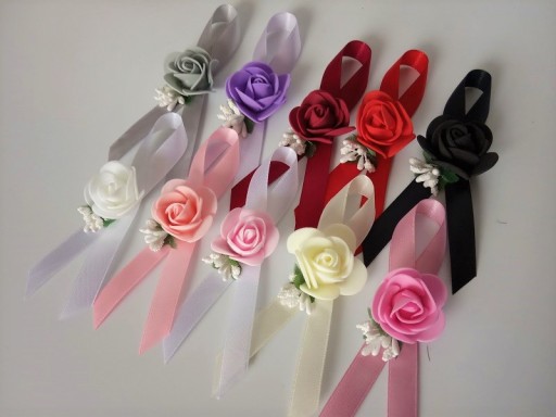Na innej aukcji dostępne są pasujące do przypinek kotyliony na rękę dla pań.