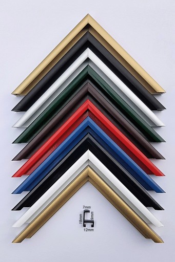 Zdjęcie kolorów i przekroju ramy: Patrząc od góry Kolor Złoty Mat, Czarny Mat ,Srebrny Mat, Zielony, Brązowy, Czerwony, Niebieski, Czarny, Biały, Złoty Pył.