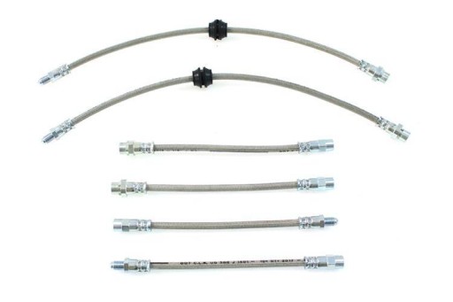 Komplet teflonowych przewodów hamulcowych w stalowym oplocie.