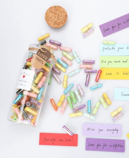 Śliczny i nowoczesny design kapsułek z tabletkami – każda szklana butelka na życzenia zawiera 90 karteczek z serduszkami.