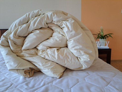 Tkanina to doskonałej jakości 100% bawełna, wykończona ozdobną lamówką - bizą. Zastosowana konstrukcja kasetonowa sprawia, iż puch jest równomiernie rozłożony w każdej kratce i nie ma możliwości przemieszczania się.