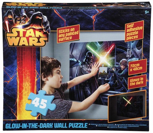 Zestaw zawiera 45 puzzle z grafiką Star Wars do ułożenia i przymocowania na ścianie.