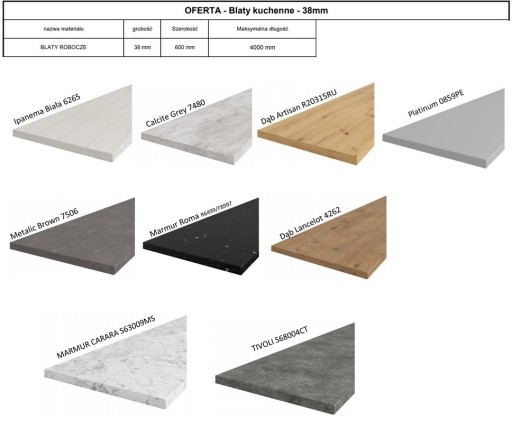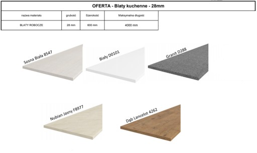 Nasza oferta pozwala Państwu wybrać kolor oraz rozmiar blatu. Posiadamy blaty 28 mm i 38 mm