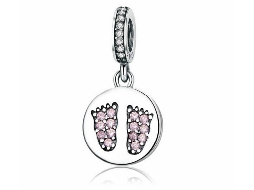 Elegancki wykonany z rodowanego srebra charms pasujący do bransolet modułowych, z okrągłą zawieszką zdobioną dziecięcymi stopkami wysadzanymi różowymi cyrkoniami.