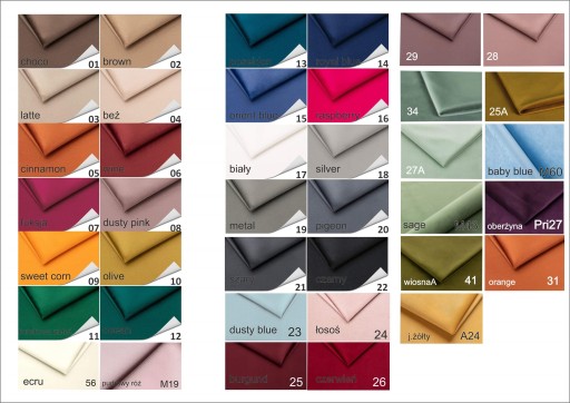 - kolor okładki - do wyboru około 35 kolorów tkaniny welurowe