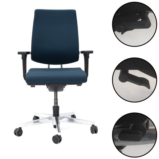 - pełen zakres regulacji: siedzisko (przód-tył, kąt nachylenia), podłokietniki (góra-dół, przód-tył), oparcie (kąt nachylenia, regulacja w odcinku lędźwiowym, możliwość blokady w dowolnym ustawieniu)
