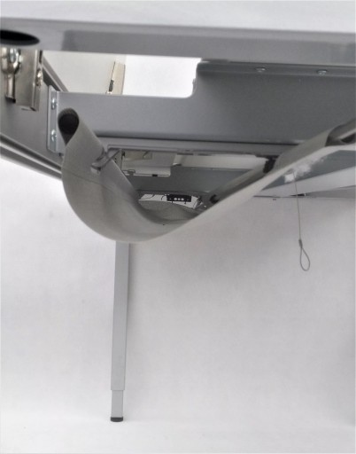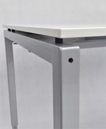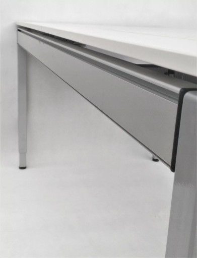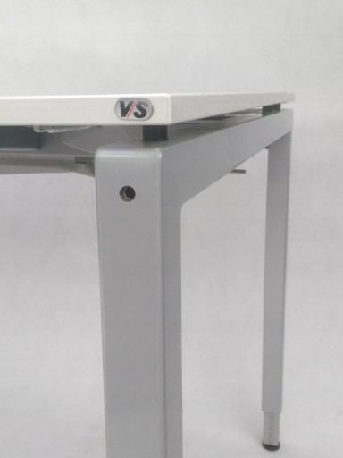 Biurko niemieckiej firmy VS to połączenie prostego designu i wysokiej jakości materiałów. Blat składa się z trzech elementów - głównej płyty i dwóch mniejszych, otwieranych. Zastosowane rozwiązanie umożliwia wygodne ułożenie przewodów. Specjalna maskownica w formie szczotek pozwala na wyciągnięcie kabli w dowolnym miejscu. Pod blatem znajduje się materiałowy uchwyt, prowadnica na kable, dzięki czemu zachowanie porządku jest znacznie łatwiejsze. Biurko wyposażone zostało w nogi wkręcane w metalowy stelaż, posiadające możliwość regulacji aby zapewnić pełną stabilność mebla. Wysokość biurka jest regulowana, co pozwala na wygodną pracę zarówno niskim, jak i wysokim osobom.