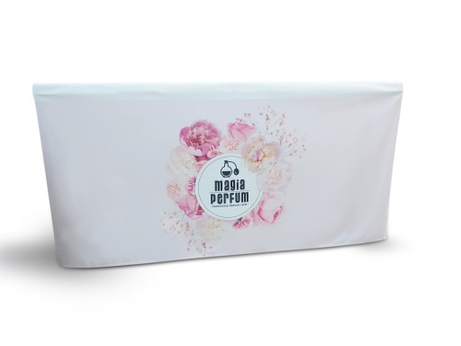 Stół eventowy z obrusem i nadrukowanym na obrusie logo lub dowolnej grafice