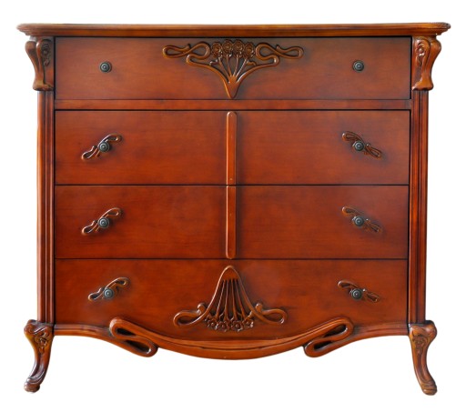 Mebel wykonany jest z drewna, ozdobiony wykonanymi ręcznie dekoracjami. Posiada cztery pojemne szuflady.