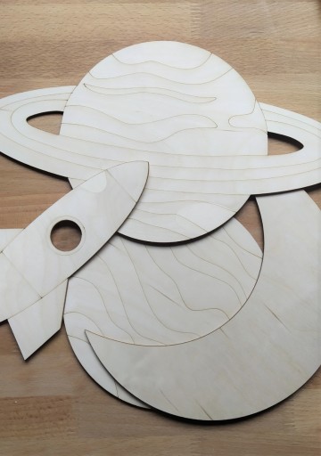 Elementy wycinane są ze sklejki brzozowej o grubości 3mm, na polu roboczym o powierzchni 130x90 cm.