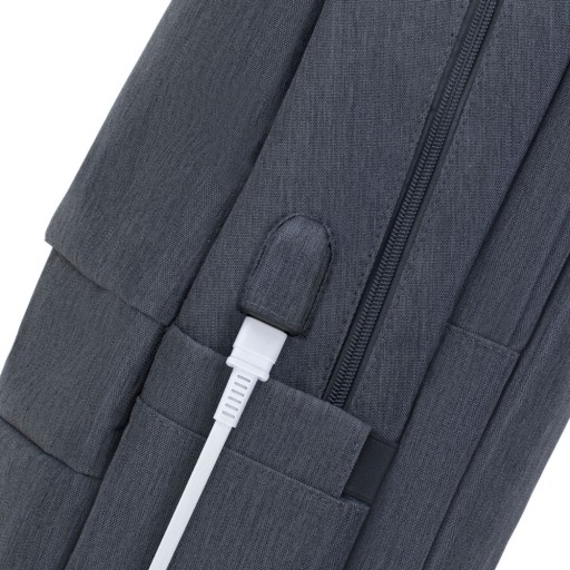 - Możliwość podłączenia przenośnego akumulatora do portu USB z boku plecaka, aby ładować urządzenia w podróży.