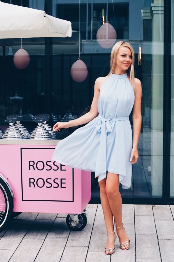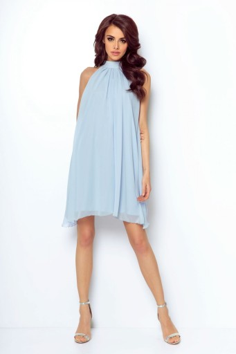 Szyfonowa, zwiewna sukienka z dekoltem typu halter z niewysoką stójką. Trapezowy fason zamaskuje niedoskonałości sylwetki, dzięki temu nasza sylwetka stanie się bardziej atrakcyjna.