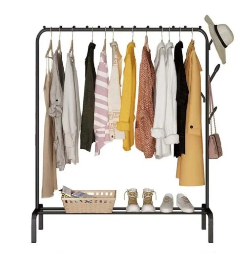Stojący wieszak na ubrania, dzięki któremu zachowasz porządek. Posiada przestrzeń na zawieszenie wieszaków, luźnych płaszczy czy kurtek oraz podstawkę na buty.