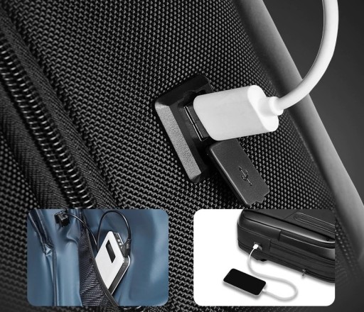 Plecak wyposażony jest w gniazdo USB, dzięki czemu nie ma konieczności wyciągania power banka z plecaka, aby naładować telefon. Uwaga, power bank nie jest częścią zestawu.