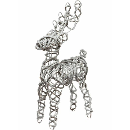 Dekoracja wewnętrzna w postaci renifera, wykonana z plecionych i ośnieżonych gałązek rotanu, posiada 10 światełek LED o ciepłej barwie, wymiary: 50x27x13 cm