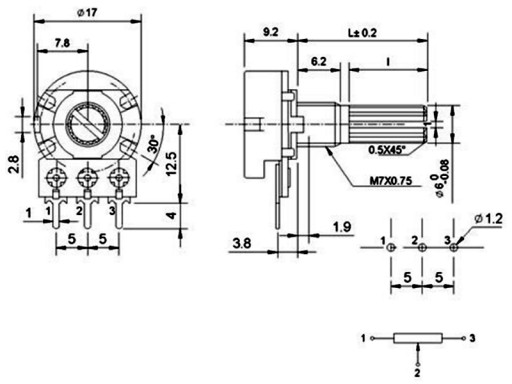 Potencjometr: osiowy: 6/15mm; jednoobrotowy; 500Ω-B; liniowa; ±10%; metal; THT; (151011)