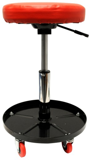 Tapicerowane siedzisko warsztatowe - stołek warsztatowy posiada pneumatyczną regulację wysokości w zakresie 400-540mm oraz 5 w pełni obrotowych kółkek.
