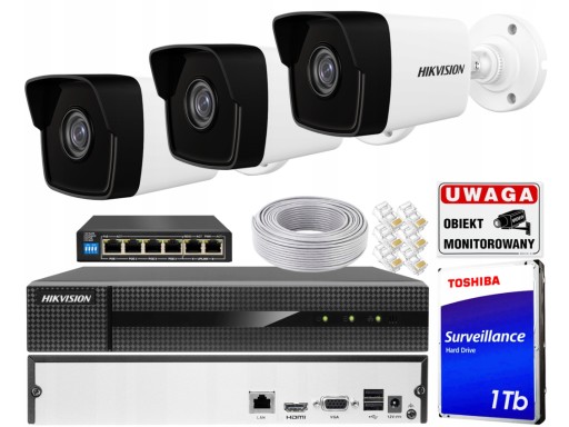 3x Kamera IP IPCAM-B4 | 1x Rejestrator 4-kanałowy IP | 1x Switch PoE | Dysk 1TB | Akcesoria montażowe