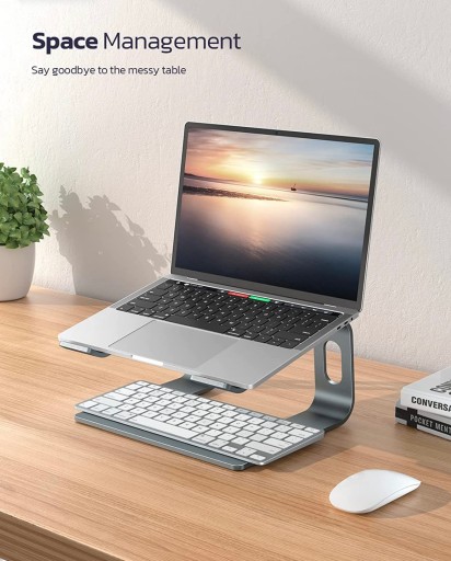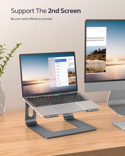 Stojak na laptopa działa jak stojak, który podnosi ekran laptopa do 7 cali i ustawia go na idealnym poziomie oczu, aby poprawić postawę. Ergonomiczny stojak pomoże zmniejszyć ból szyi i pleców, zmniejszy zmęczenie oczu, tworząc dodatkową przestrzeń, dając możliwość pracy bez bałaganu na biurku. Uwaga: Sugerujemy korzystanie z zewnętrznej klawiatury i myszy Bluetooth, ponieważ nasze testy wykazały, że podczas pisania na klawiaturze laptopa mogą one nieco chybotać.