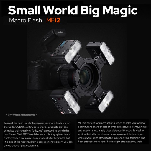 [Kombinacja wielu błysków] Łatwa do uzyskania kombinacja wielu błysków makro dzięki pierścieniowi montażowemu (brak w zestawie), o jaśniejszym źródle światła przy jednoczesnym zmniejszeniu cieni na obiektach; posiada regulowaną głowicę do szybkiego pozycjonowania i regulacji kąta, co znacznie rozszerza jego zastosowanie.