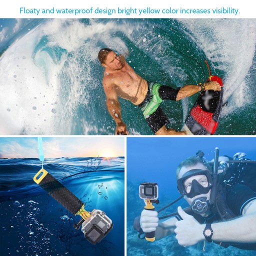 Ten ruchomy uchwyt jest odpowiedni do różnych kamer sportowych. To sprawia, że uchwycisz wspaniałe chwile w wodzie. Pływająca i wodoodporna konstrukcja w kolorze jasnożółtym zwiększa widoczność.