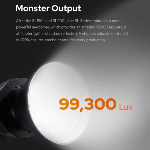 - 【Większa moc i wyższa jasność】 Po SL150II i SL200II, seria SL obejmuje mocniejszego nowicjusza - SL300II, który zapewnia wyższą moc wyjściową o 320 W i wyższą jasność o 99300 luksów przy 1 M (ze standardowym odbłyśnikiem). Bezstopniowa regulacja od 0 do 100% zapewnia precyzyjną kontrolę dla każdej produkcji.