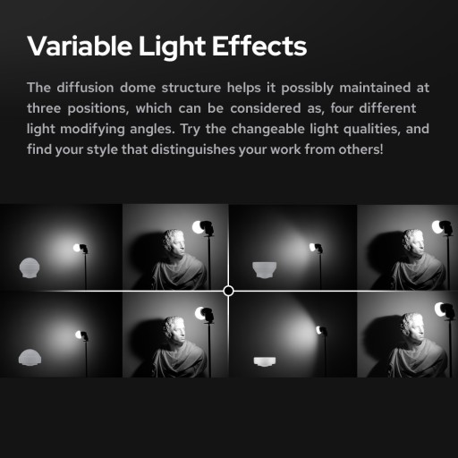 [Składana kopuła dyfuzyjna] Oferuje zmienne kształty do kształtowania światła, zapewniając 3 różne kąty modyfikujące światło, dzięki czemu Twoje arcydzieło różni się od innych!