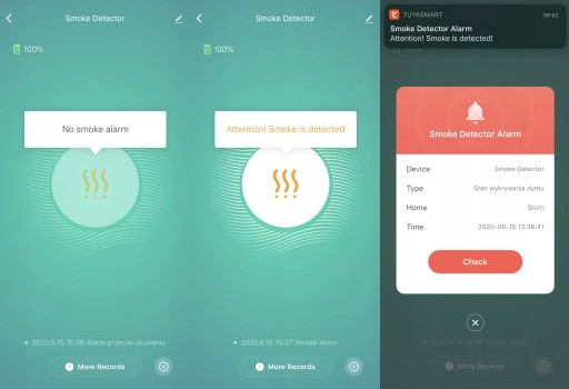 Po wykryciu dymu urządzenie rozpoczyna sygnalizację dźwiękową 80 dB, świetlną z jednoczesnym powiadomieniem na telefon, aby chronić Twoich bliskich i Twoją własność.
