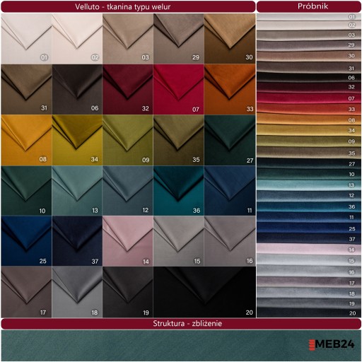 ➡️ Velluto - Tkanina typu welur ➥ Tkanina meblowa typu welur, miła i miękka w dotyku o eleganckim, delikatnym połysku oraz modnej kolorystyce. Sprawdzi się jako materiał na duże meble tapicerowane oraz dekoracje, takie jak panele ścienne, zasłony oraz pokrowce.