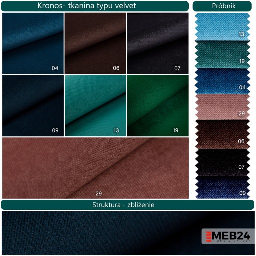 ➡️ Kronos - Tkanina typu velvet ➥ Pluszowa w odczuciu tkanina velvetowa Kronos jest delikatna i miła w dotyku. Jej widoczna struktura przypominająca wyglądem plecionkę zapewnia wysoką wytrzymałość i oryginalny wygląd. Duża liczba kolorów oraz wysoka odporność na płowienie to gwarancja, że mebel latami będzie cieszył oko jego użytkowników.