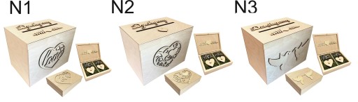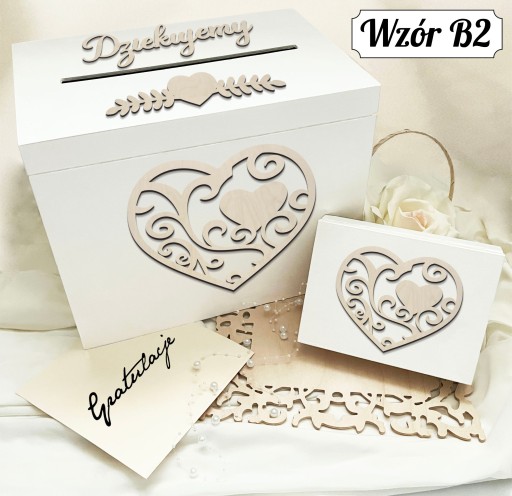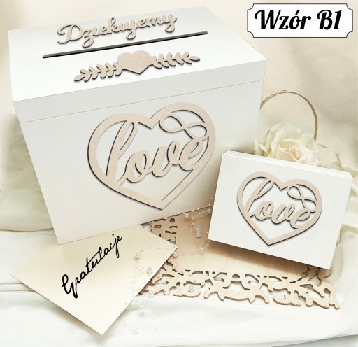 1.Pudełko na koperty i zyczenia ślubne w wybranym przez Ciebie wzorze (w przypadku braku informacji towar wysyłamy we wzorze z miniaturki) z doklejonymi elementami w tonacji surowego drewna.
