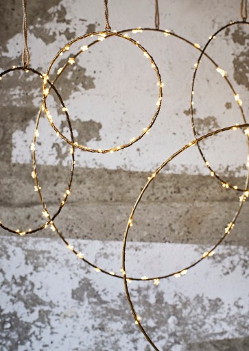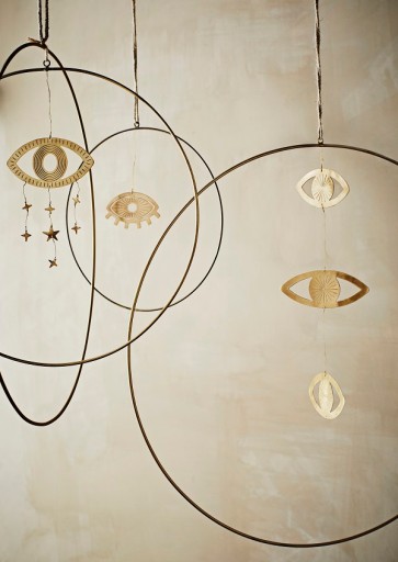 Dekoracja wisząca w kształcie koła. Wykonana z metalu w kolorze mosiądzu, na jutowym sznurku. Dekoracja daje wiele możliwości aranżacyjnych. Może wisieć sama jako ponadczasowa, elegancka ozdoba. Można udekorować ją sznurem światełek, gałązką przyniesioną z lasu, suszonymi kwiatami czy girlandą z muszelek. Można zapleść wokół niej świąteczny wianek. W każdej stylizacji wygląda świetnie. Ozdoba salonu i sypialni.