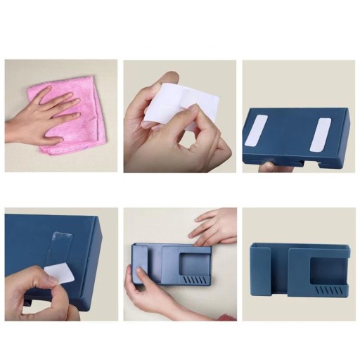 Prosty i wygodny montaż na ścianie dzięki taśmie samoprzylepnej zamontowanej na półce. Wysoka konstrukcja uniemożliwia wypadnięcie umieszczonego wewnątrz urządzenia.