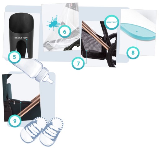 * wszystkie wymienione akcesoria są oryginalnymi produktami firmy BEBETTO, które są dopasowane kolorystycznie do tapicerki i stelaża wózka, zdjęcia są poglądowe i mogą odbiegać od ich oryginalnego wyglądu.