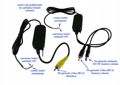 Moduł bezprzewodowej transmisji sygnału video. Stworzony z myślą o współpracy z samochodową kamerą cofania a monitorem czy innym sprzętem video wyposażonym w dodatkowe wejście sygnału video.