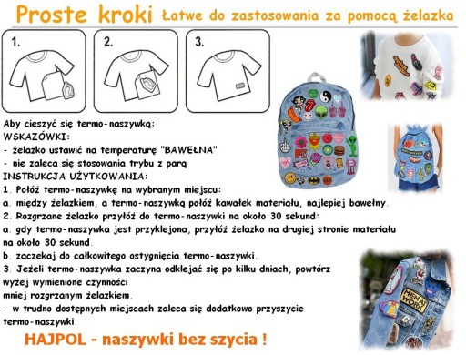 Naszywki posiadają od spodu warstwę specjalnego kleju, który umożliwia przyklejenie ich za pomocą żelazka na stałe do odzieży.
