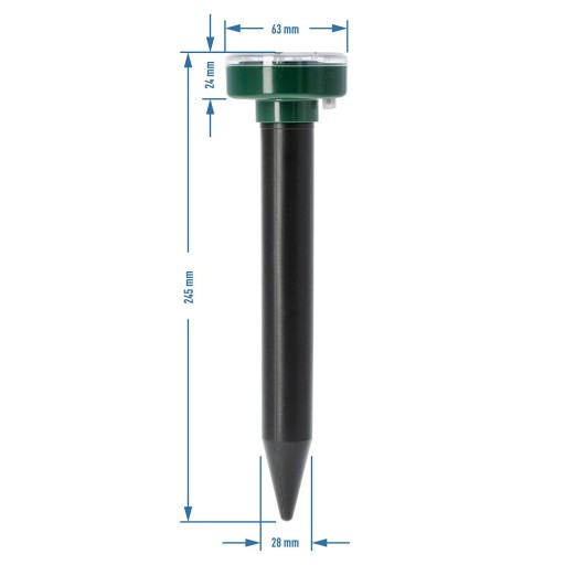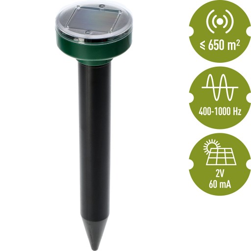 Odstraszacz ten to nowoczesne urządzenie służące do skutecznego, humanitarnego oraz bezkontaktowego odstraszania kretów i innych gryzoni. Emituje fale ultradźwiękowe i elektromagnetyczne o częstotliwości 400-1000 Hz, które są jedynie lekko słyszalne dla człowieka. Jest bezwonny, a także całkowicie bezpieczny dla ludzi oraz zwierząt, nie zakłóca działania innych urządzeń elektrycznych. Skutecznie pozbywa się niechcianych intruzów, tworząc niewidzialną barierę na obszarze ok. 650 m2 (w przestrzeni nie ograniczonej przeszkodami). Wysoce skuteczny - różna częstotliwość dźwięków generowanych w odstępach co 25-50 sekund zapobiega przyzwyczajeniu się szkodników do emitowanego sygnału i gwarantuje ich odstraszanie.
