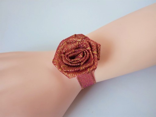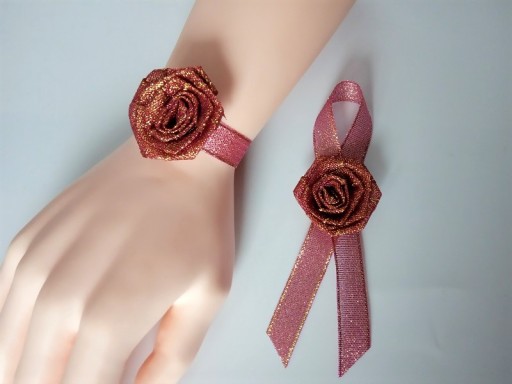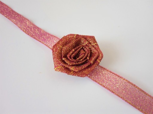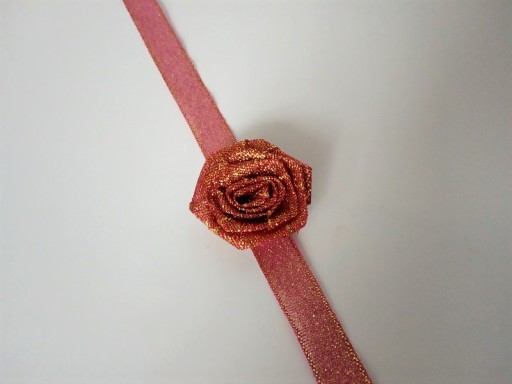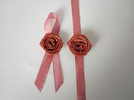 Ozdoba wykonana jest z satynowej brokatowej różyczki i wstążki.