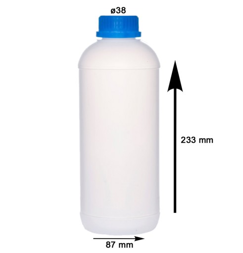 Butelka plastikowa 1L HDPE bezpośrednio od producenta Poli-Szer. Pojemnik przeznaczony do przechowywania różnych substancji w tym chemicznych. Posiada nakrętkę o wielkości ø38 z wkładką z polietylenu spienionego zapewniając szczelność opakowania.