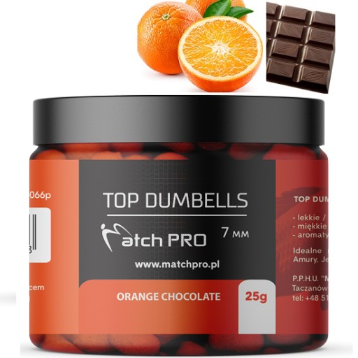 Seria najwyższej jakości przynęt o kształcie wałka (dumbells) w rozmiarze 7mm. Długie i intensywne testy tych przynęt pozwoliły dopracować ich skład i właściwości tak aby były bardzo skuteczne w każdych warunkach. To co wyróżnia Matchpro top dumbells to idealna miękkość, dzięki której ryby pewnie ją pobierają. Wyjątkowa lekkość przynęty zapewnia bardzo naturalne zachowanie się w wodzie co niezwykle podnosi skuteczność łowienia. Top Matchpro Dumbells są bardzo aromatyczne, oddając przez długi czas równomiernie aromat w wodzie co przekłada się na dużą ilość brań. Różnorodność smaków i kolorów pozwala dopasować się każdemu wędkarzowi do aktualnych warunków panujących na łowisku.