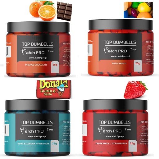 Seria najwyższej jakości przynęt o kształcie wałka (dumbells) w rozmiarze 7mm. Długie i intensywne testy tych przynęt pozwoliły dopracować ich skład i właściwości tak aby były bardzo skuteczne w każdych warunkach. To co wyróżnia Matchpro top dumbells to idealna miękkość, dzięki której ryby pewnie ją pobierają. Wyjątkowa lekkość przynęty zapewnia bardzo naturalne zachowanie się w wodzie co niezwykle podnosi skuteczność łowienia. Top Matchpro Dumbells są bardzo aromatyczne, oddając przez długi czas równomiernie aromat w wodzie co przekłada się na dużą ilość brań. Różnorodność smaków i kolorów pozwala dopasować się każdemu wędkarzowi do aktualnych warunków panujących na łowisku.