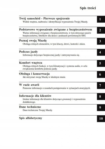 Instrukcja obsługi Mazdy zawiera wszystkie wersje wyposażenia oraz przydatne informacje jak sprawnie i bezpiecznie użytkować pojazd np.-wskaźniki, lampki kontrolne, otwieranie i zamykanie-oświetlenie i widoczność, fotele, schowki, ogrzewanie, wentylacja, klimatyzacja-jazda, wskazówki eksploatacyjne, konserwacja pojazdu-poziomy płynów, sprawdzanie i uzupełnianie, czynności awaryjne, wymiana kół, bezpieczniki, wymiana żarówek-dane techniczne... oraz wiele wiele innych rzeczy, które dają poczucie bezpieczeństwa oraz komfortu podróżującym. Polskie prawo nakłada na sprzedawcę obowiązek dołączania instrukcji obsługi auta w języku polskim do . Instrukcja obsługi auta jest nowa i w języku polskim.