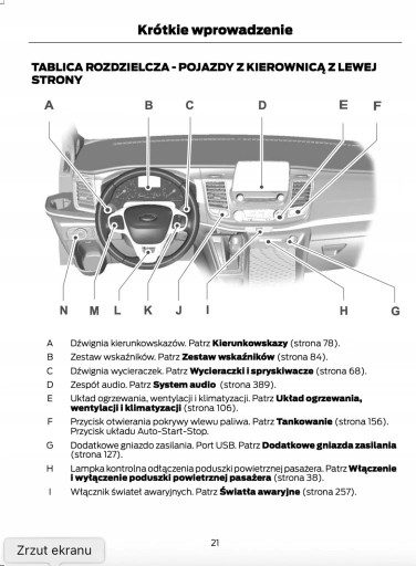 Instrukcja obsługi Forda zawiera wszystkie wersje wyposażenia oraz przydatne informacje jak sprawnie i bezpiecznie użytkować pojazd np.-wskaźniki, lampki kontrolne, otwieranie i zamykanie-oświetlenie i widoczność, fotele, schowki, ogrzewanie, wentylacja, klimatyzacja-jazda, wskazówki eksploatacyjne, konserwacja pojazdu-poziomy płynów, sprawdzanie i uzupełnianie, czynności awaryjne, wymiana kół, bezpieczniki, wymiana żarówek-dane techniczne... oraz wiele wiele innych rzeczy, które dają poczucie bezpieczeństwa oraz komfortu podróżującym. Polskie prawo nakłada na sprzedawcę obowiązek dołączania instrukcji obsługi auta w języku polskim do . Instrukcja obsługi auta jest nowa i w języku polskim.