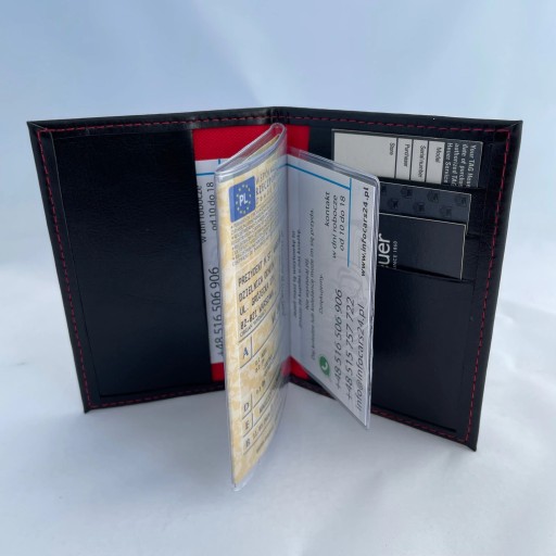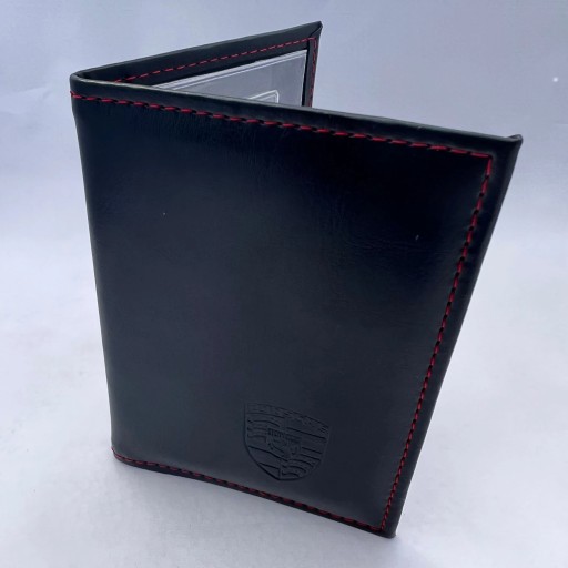 - PORSCHE - etui na dowód rejestracyjny oraz wizytówki , prawo jady oraz karty płatnicze a nawet jako portfel Bardzo solidny wyrób krajowy ze skóry ekologicznej . Ręczna robota. Wymiary :Przedmiotem sprzedaży jest tylko etui.