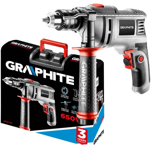 Uniwersalna wiertarka udarowa GRAPHITE o mocy 650 W, doskonale poradzi sobie z materiałami, takimi jak drewno, tworzywa sztuczne, metal czy ceramika. Po przełączeniu na tryb wiercenia udarowego, wiercenie w materiałach takich, jak beton lub cegła przebiegać będzie równie sprawnie. Wiertarka podczas wiercenia osiąga do 3000 obrotów na minutę, a po włączeniu udaru częstotliwość uderzeń dochodzi do 48000 w ciągu minuty. Elektronarzędzie posiada możliwość obrotu głowicy w prawo i lewo. Ergonomiczna konstrukcja, niewielka waga urządzenia oraz długi przewód zasilający zdecydowanie ułatwią pracę w trudno dostępnych miejscach. Ogumowana rękojeść główna podnosi komfort i bezpieczeństwo pracy. Przechowywanie i transport ułatwia schowek na wiertła ulokowany w dodatkowej rękojeści oraz praktyczna walizka. Urządzenie wyposażono w elastyczny i wytrzymały przewód zasilający w powłoce gumowej o długości 3m, dedykowany także do zastosowań profesjonalnych i przemysłowych zarówno wewnątrz jak i na zewnątrz pomieszczeń.