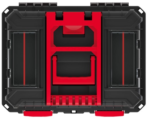 - dwa organizery w pokrywie (szer. 7,8 cm, dł. 16,4 cm, gł. 4,5 cm) zamykane przeźroczystą pokrywą z poliamidu, w komplecie dwie kuwetki i dwie przegrody.