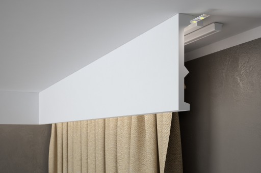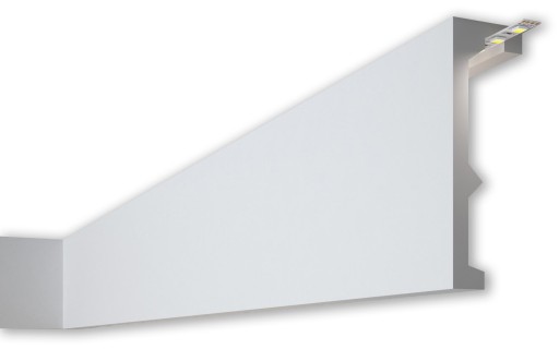 Listwa QL056 stanowi doskonałą bazę do łączenia z pozostałymi wzorami gzymsów przysufitowych oraz pozwala na montaż oświetlenia ledowego. Bardzo długie odcinki maskownicy – 240 cm – pozwalają na minimalizację ilości wykonywanych łączeń.